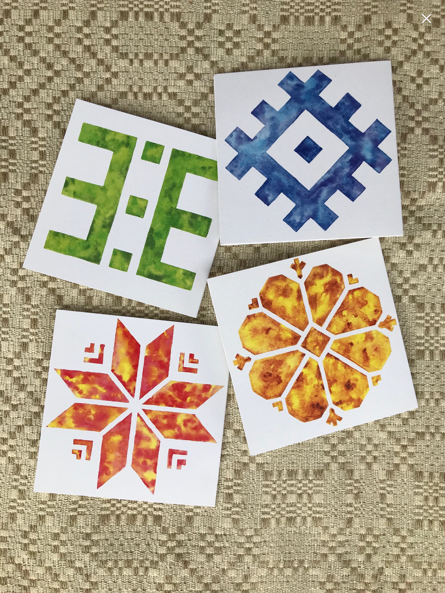 Watercolor Latvian Symbols Based on 8×8″ watercolor paintings of mine. I created 4×4″ cards to sell on Etsy.